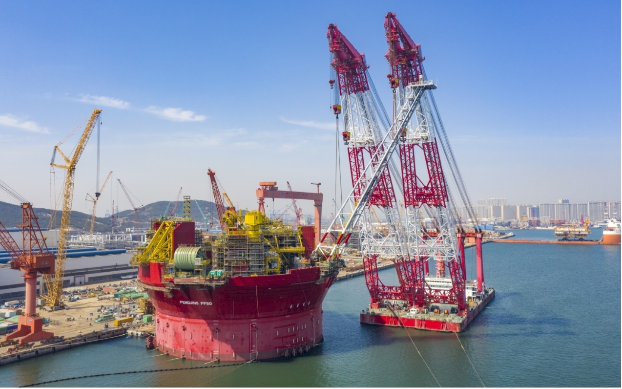 Project introduction: The Penguins FPSO project is the first cylindrical FPSO construction project undertaken by COOEC. The project, located in the North Sea, UK, is 160km away from the coastline with 165m water depth. With 3*4 multi-point mooring systems employed, the FPSO units of this project are designed according to the concept of SEVAN 400 cylindrical FPSO with a design life of 20 years and a total weight of about 31,000 tons, among which the total weight of the hull is about 17,000 tons and the total weight of the topside is about 14,000 tons.
