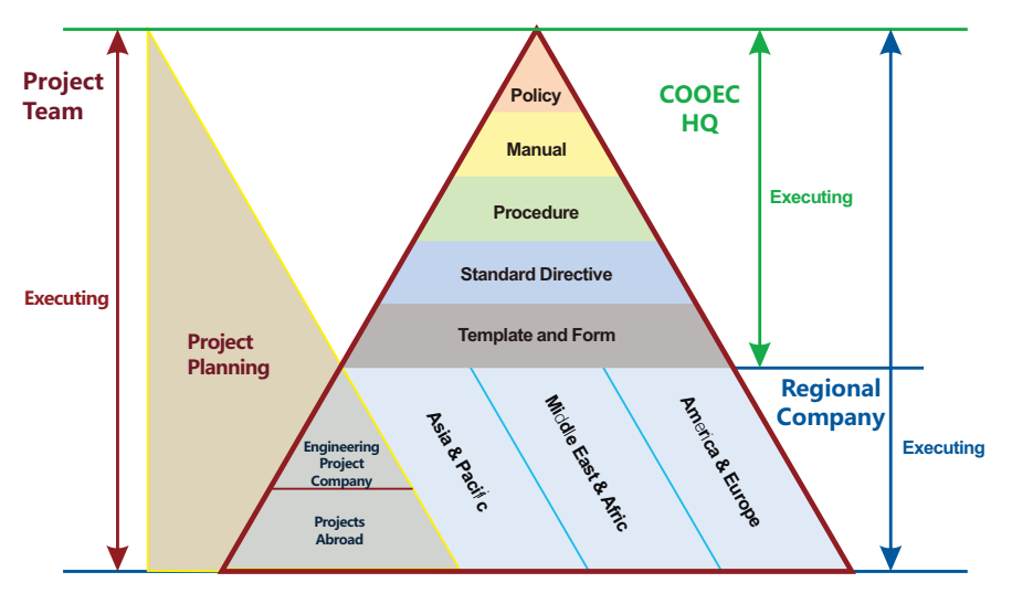 COOEC QHSE management system encompasses three dimensions: headquarters, regional companies, and projects. We tailor our management system to specific regions and projects based on our headquarters-level management system, which comprises five levels: policy, management manual, procedure, standard directive, and template & form.