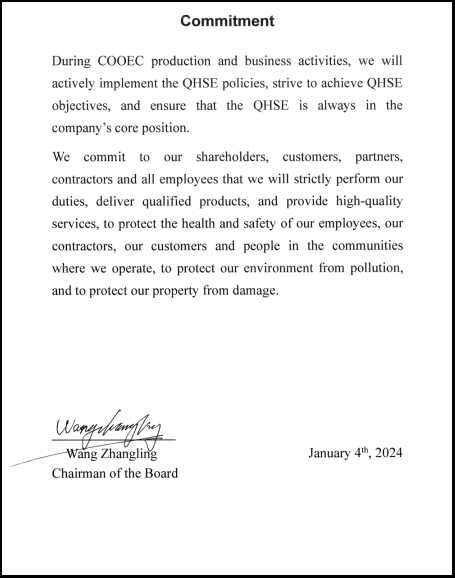 COOEC is committed to fulfilling its social responsibilities and upholding a systematic approach to management. We have established an internationally certified QHSE (Quality, Health, Safety, and Environmental) management system that prioritizes risk control, propelling our QHSE performance to the forefront of the industry globally.